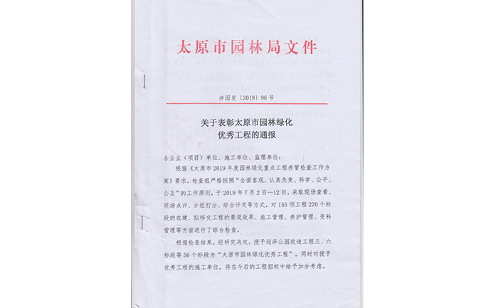 我公司19項(xiàng)工程榮獲2019年度 “太原市園林綠化優(yōu)秀工程”